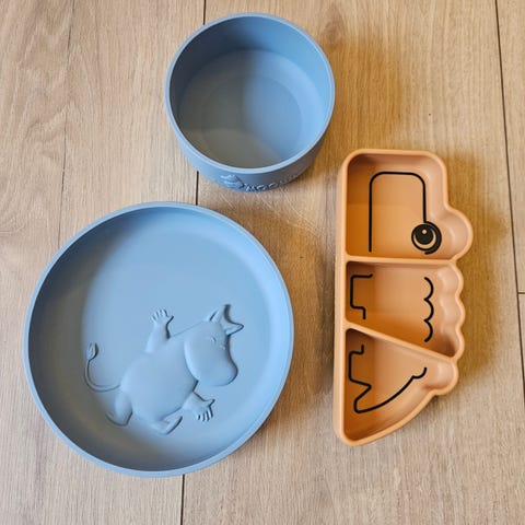 Fat med mummimotiv. Motivet er intakt, men er litt bruksstrekar. Ein ser dei spesielt godt om ein held fatet skeivt under lyset, sjå bilde.