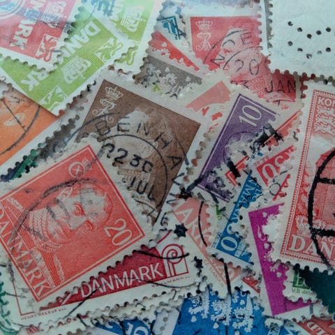 Flere eldre norske merker, blant annet motiv av kong Olav V og klassiske portomerker