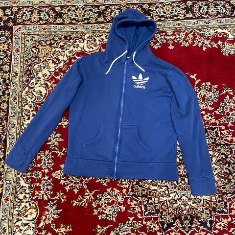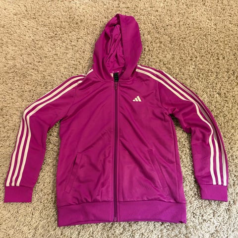 Adidas Originals hettejakke for dame i størrelse 38. Jakken er rosa med hvite striper på ermene og har glidelås foran. Laget i mykt materiale egnet for sport og fritid.