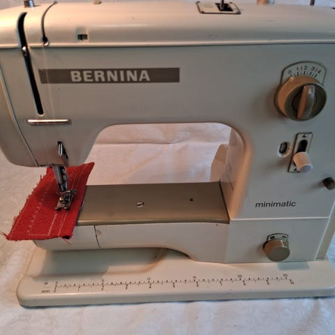 Bernina Minimatic symaskin med original koffert, tilbehør inkludert trådsneller, nåler og bruksanvisning. Symaskinen er mekanisk med justerbare innstillinger for ulike stingtyper. Leveres med original garanti og dokumentasjon. Passer til hobby- og lett industriell bruk.
