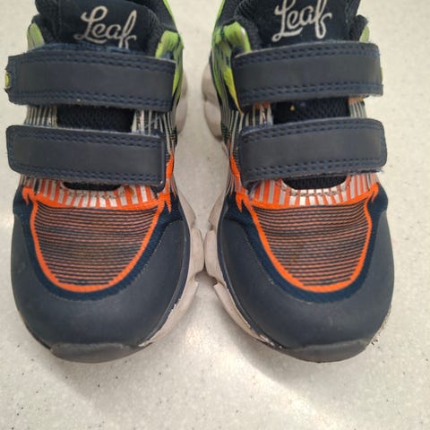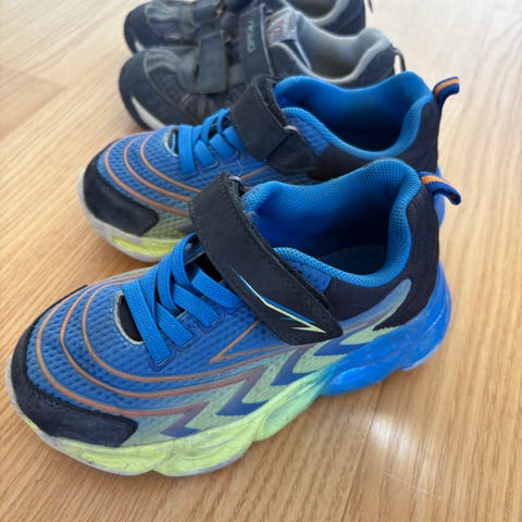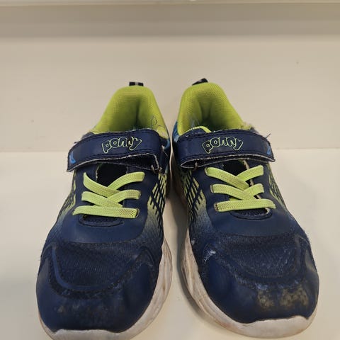 Blinkesko i merket Ponny. Skoene er blå med gulgrønne detaljer. Lysene er gule og blå.