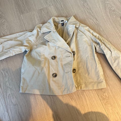 Jakke i størrelse 34. Den har noen merker på ryggen se bilde nr. 2 har ikke prøvd å vaske den. Går nok bort i vask.