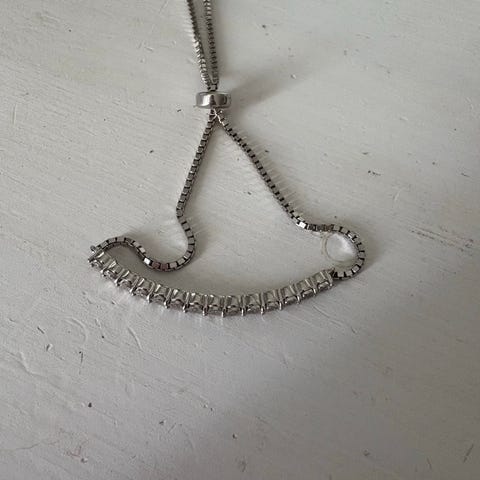 Glitter armbånd for dame laget av andre materialer med sølvfarget utseende. Armbåndet har justerbar lengde med en glideknapp for tilpasning. Designet med to rader av små, glitrende elementer som gir et dekorativt uttrykk.