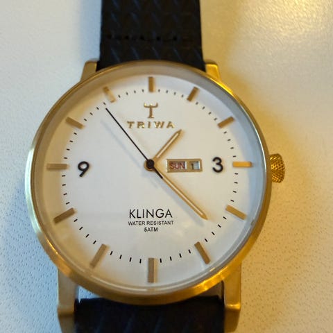 Rosengull detaljer, svart skinn rem og hvit skive.
