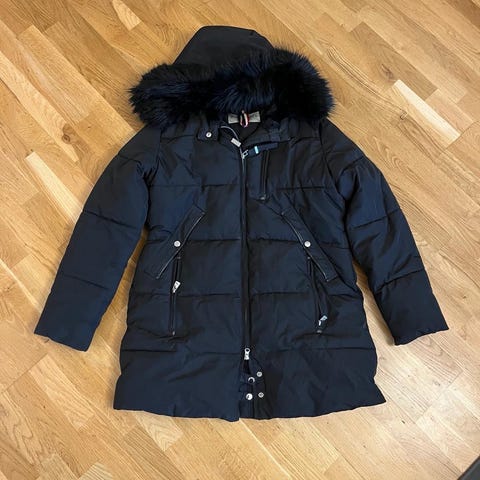 Meget elegant fransk , charcoal ( mørke grå) , ny ull kåpe med hette selges .