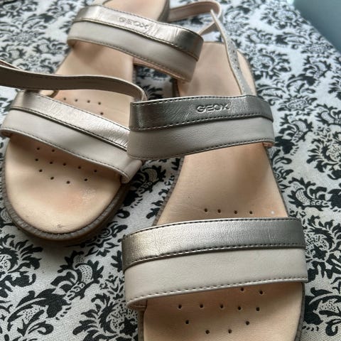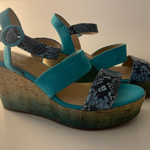 Har to par Geox sandaler i skinn med kilehæl som ikke er brukt noen gang, da jeg dessverre ikke kan gå med så høye hæler har jeg funnet ut. De er kun prøvd på. Størrelse 5,5 (uk) tilsvarer 39. Dette skoparet er lilla, de andre er brune(annen annonse) Nydelige sko!