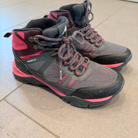 Coretex Fjellsko, tursko, i størrelse 35. Skoene har en kombinasjon av grå og rosa farger, med solid yttersåle for godt grep. Designet for fotturer, med justerbar stropp og snøring for optimal passform. Materialet ser ut til å være slitesterkt og egnet for utendørs bruk.