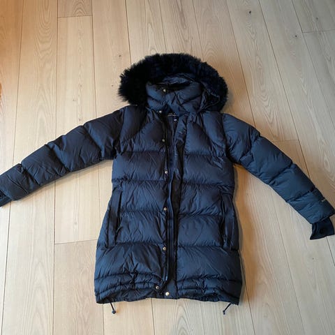 Halvlang modell som rekker til ca midt på låret, proppfull av dun og i tillegg har den varm skinnkrage som kan kneppes av. Egner seg like godt til hverdag og fest.