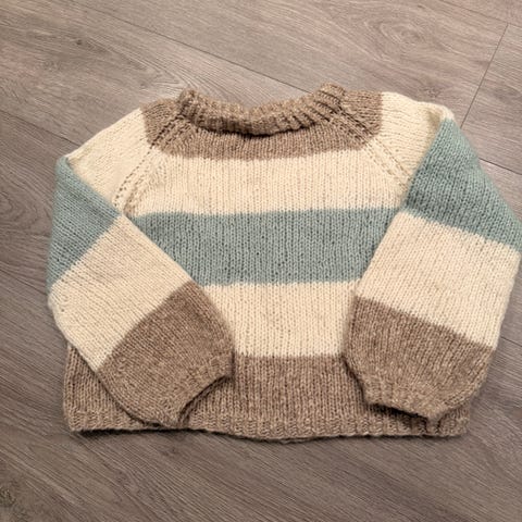 Helt ubrukt, hjemmestrikket genser, pris på garnet 600,-