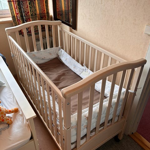 Uttrekkbar barneseng av hvitmalt heltre