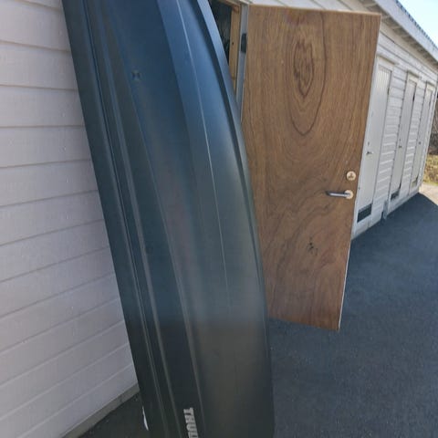 Biltema takboks. Boks til ski og bagasje. Pent brukt, svart farge. Lengde 215 cm, bredde 55 cm. Høyde bak 35 cm. Høyde foran 20 cm. Boksen har bøyler til å træ innpå lastbærere, to foran, to bak.. Festes lett med strammeskruer inni boksen