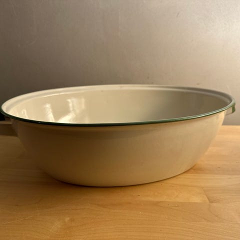 VINTAGE tisse-potte i emalje med grønn kant, selges.