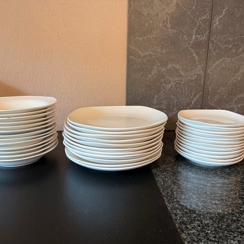 Brukt servise i hvit keramikk fra Home & Cottage. Selges samlet