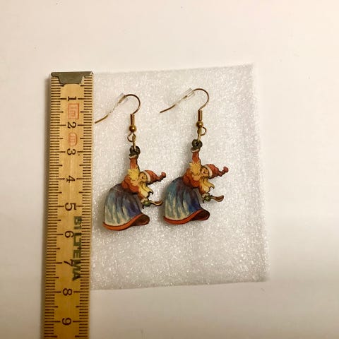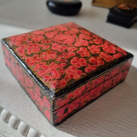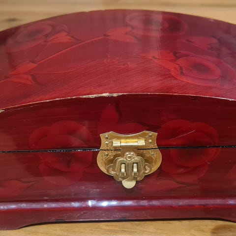 Flott vintage tine i tre, påmalte blomster på begge sider .Flott lokk ,med gullstriper, det er tungt .22×6cm uten lokk 15,5cm med lokk