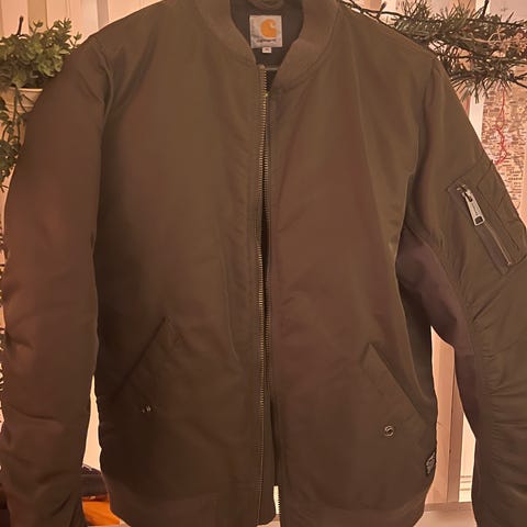 Carhartt fleecejakke for menn i størrelse S. Jakken har kamuflasjemønster og er laget av fleece-materiale. Designet for utendørsbruk med avslappet passform.