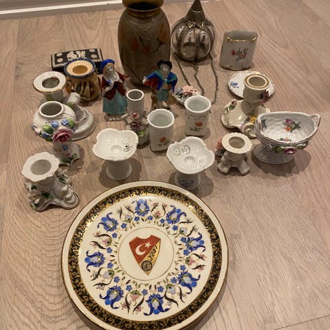 De er laget i keramikk med abstrakt motiv. Kan brukes til pynt eller servering. Selges samlet for 50 kr.