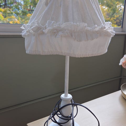 Liten og søt bordlampe i porselen. Design som en gammel parafinlampe. Lampeskjerm festes på lyspæra, kan evt byttes ut.