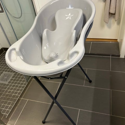 Badebalje med nyfødtstøtte og stativ selges for 250 kr. En sugekopp av to ikke sitter fast. (Se på bilde) må lime.