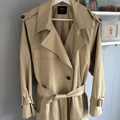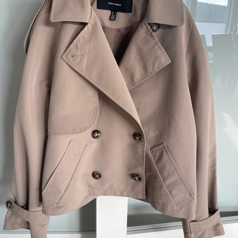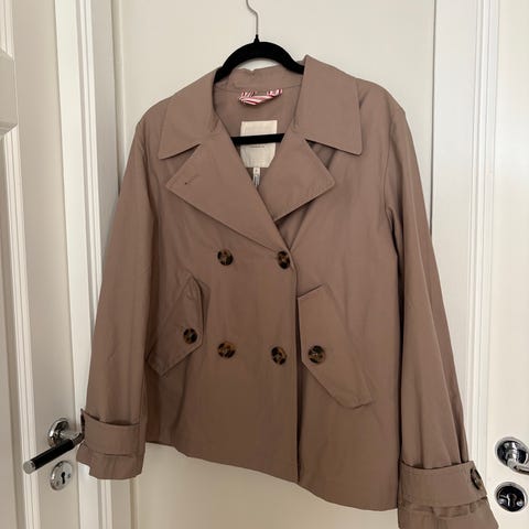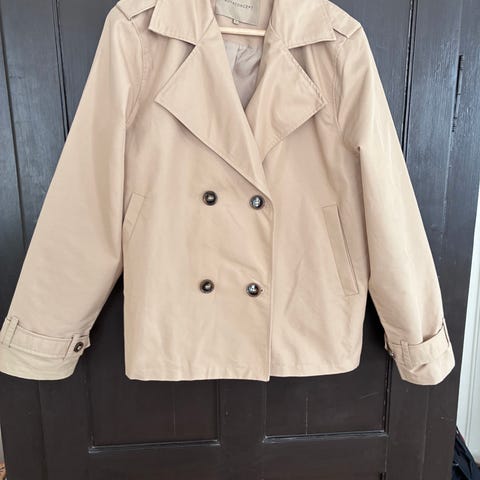 KappAhl - kort trengh yttertøy i beige farge, størrelse L for kvinner , men stør størrelse - passer 44/46. Jakken har dobbeltradet knappelukking og lommer foran. Materialet er tilpasset utendørs bruk.