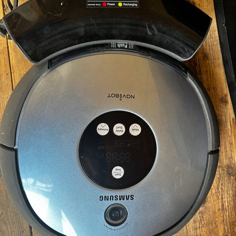 Samsung Jet Bot Robotstøvsuger i fargen Misty White. Modellen har avansert navigasjonsteknologi for effektiv rengjøring av gulvflater.