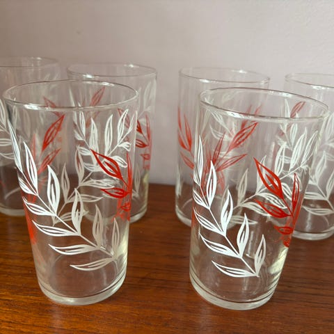 6 fargerike retro vannglass fra 60/70-tallet i flott stand. Rød og gult geometrisk mønster.