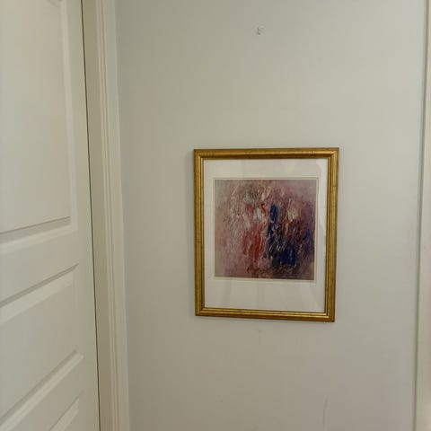 Dette er et maleri av Jakob Weidemann, en norsk kunstner, med tittelen “Henie Onstad”. Maleriet er preget av abstrakte former og farger, typisk for Weidemanns stil, og er rammet inn i en svart ramme. Kan leveres i Oslo og omegn.
