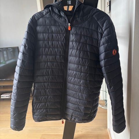 Save The Duck Jakke i blå navy farge, størrelse L for menn. Jakken er lett og polstret, egnet for utendørs bruk. Den har hette og glidelås foran, laget av syntetisk materiale uten bruk av dyrefjær.