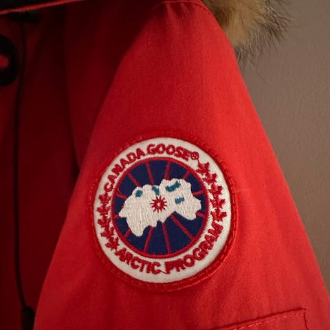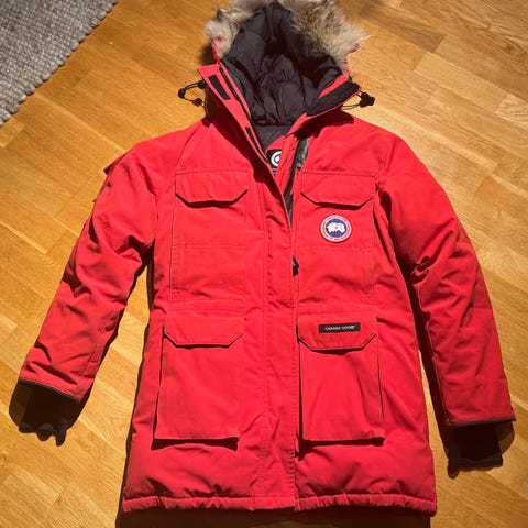 Canada Goose i rød farge, størrelse M. Jakken har flere lommer og en hette med pelskant. Innvendig fôr i svart materiale. Jakken er designet for både menn og kvinner. Egnet for utendørs bruk i kalde vinterforhold.