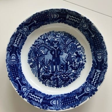 Saft/melkemugge, hvit med dekor i blått.