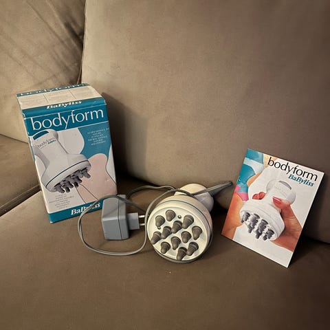 VelaShape Anti-Cellulite Massager er en enhet designet for å redusere cellulitter. Produktet kommer i en rosa eske med hvite dekorative linjer. Inkluderer funksjoner som er rettet mot kroppsmassasje for å forbedre hudens utseende.