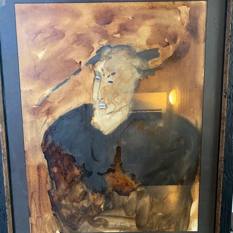 72 x 72cm. Originalt oljemaleri. Spennende farger og motiv i flott innramming.