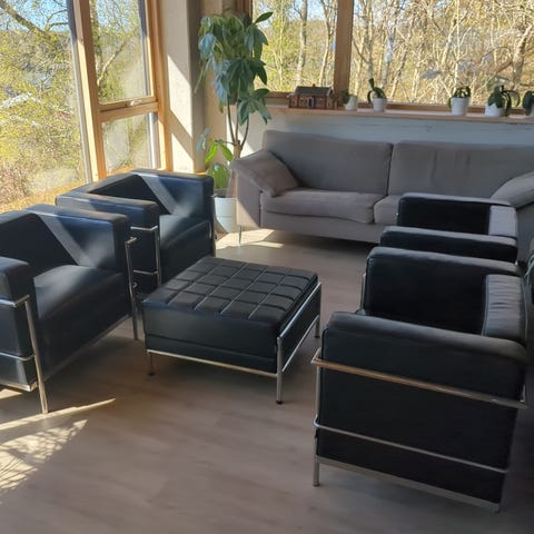 Sittegruppe i skinn bestående av fire loungestoler og glassbord.