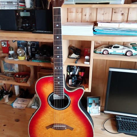 Ibanez halvakustisk baritone gitar med cutaway-design. Utstyrt med innebygd preamp for forsterkning. Upåklagelig lyd! Gitaren har en naturlig trefinish og seks strenger. Lite brukt. Pris kan diskuteres ved rask handel ✌️