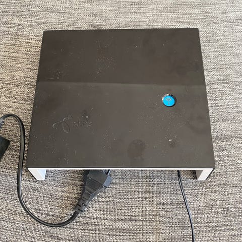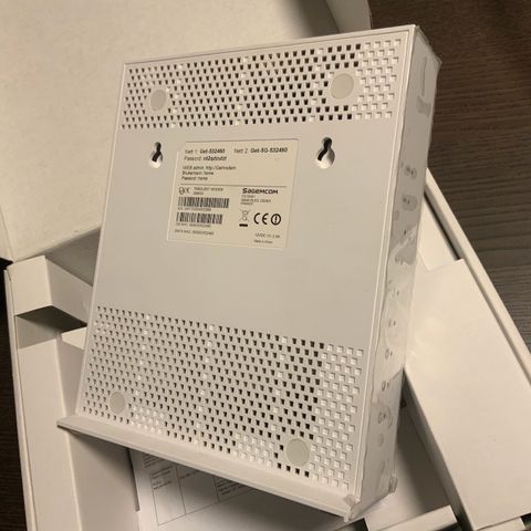Telenor Trådløst multimodem Router i svart farge. Designet for bredbånd og bredbåndstelefoni. Modemet har flere porter for tilkobling, inkludert LAN-porter og telefonporter. Enheten har en kompakt og moderne design med en blank overflate.