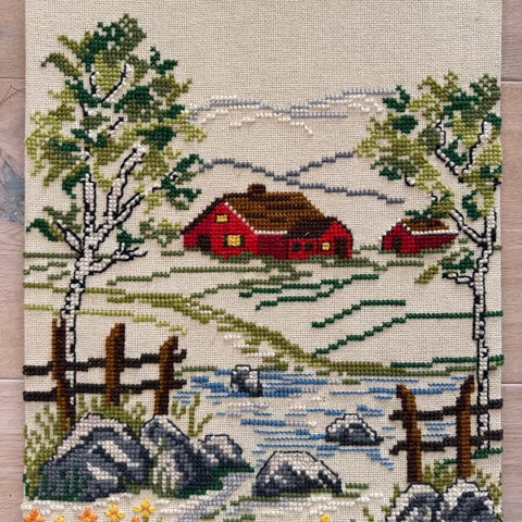 Broderi som viser en kvinne ved en grind med en sæter og trær i bakgrunnen. Fargene er i jordtoner med detaljer i beige, brunt og svart. Passer som dekorasjon for vegg i hjem eller hytte.