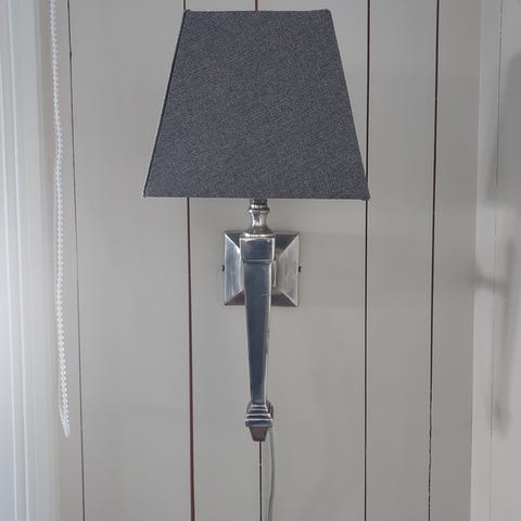 Sølvfarget med offwhite skjerm. Skjermen er 23cm x18 cm. Fra toppen av skjermen til bunnen av lampen er det 70 cm.