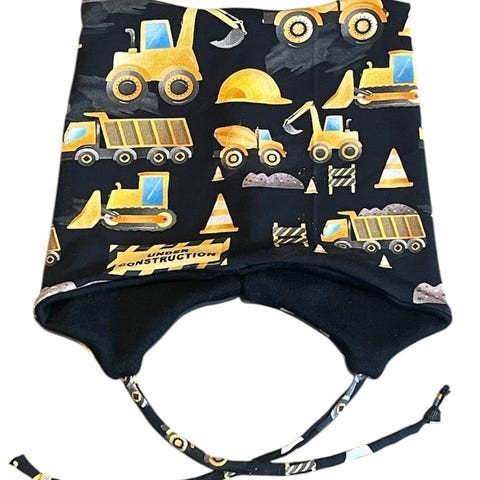 Hjemmesydde luer i str 1-2 år, sydd i mykt økologisk jerseystoff utenpå og merinoull inni. Perfekt vinterlue som dekker ørene godt. Figurene er refleks.