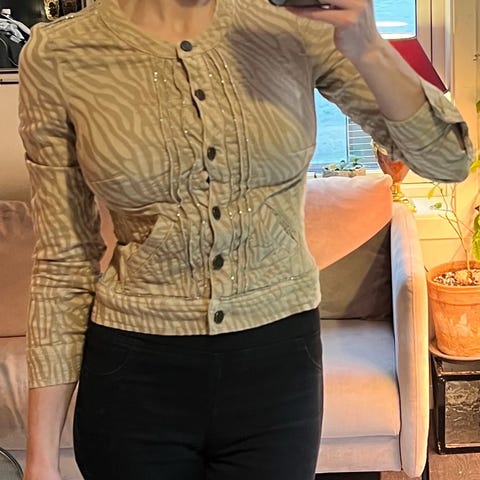 Veldig myk og søt cardigan i kashmir fra Louis Vuitton. Ser dessverre ikke på etiketten lenger hva den inneholder. Det er godt brukt, men mye bruk igjen. Ingen synlig feil.