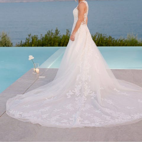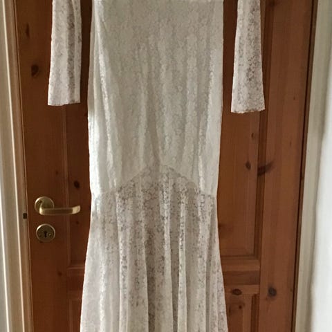 Hvit kjole i størrelse S med kort erme og blomstermønster. Kjolen har et lett og delikat stoff med broderte blomsterdetaljer.