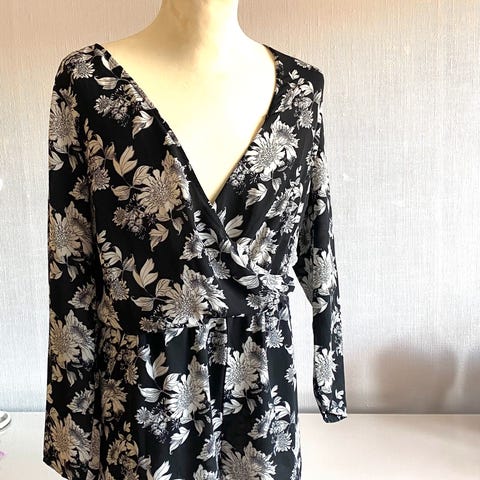 Søkeord: blomstrete jumpsuit, playsuit dame, romper, sort jumpsuit, svart playsuit, blomsterprint, gule blomster, omslagsliv, v-hals, langermet, strikk i midjen, lett stoff, sommerplagg, vårplagg, casual, fest, hverdagsbruk, feminin, trendy, mote, dameklær, pent brukt