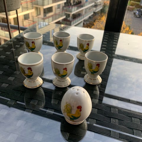 6 eggeglass i Bondemønster fra Porsgrunn. Salt & pepper er solgt! Alle delene er i meget god stand. Ønsker bud over kr. 100,- per del. Hentes i Tønsberg eller pakkes godt i bobleplast og sendes for kr. 70,- inkl. sporing og forsikring