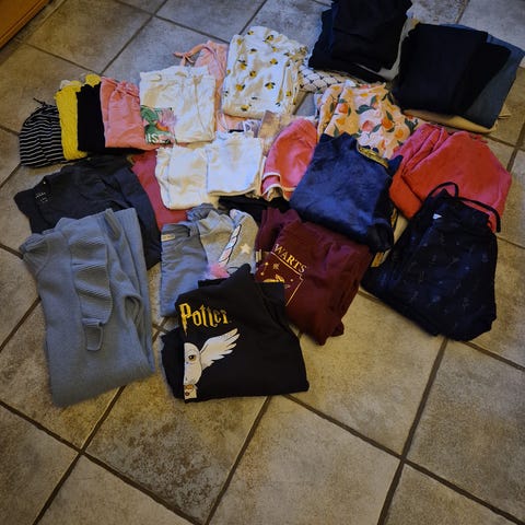 Innholdsrik klespakke, str 134-140, noe helt nytt med lappen på, noe litt brukt og annet mye brukt: