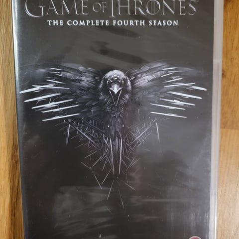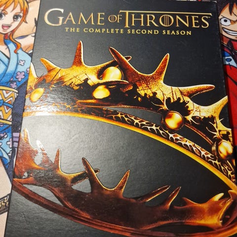 Game of Thrones Komplett andre og åttende sesong DVD. Serien inkluderer to sesonger med flere episoder per sesong. DVD-format, passer for samlere og seere av fantasy-serien.