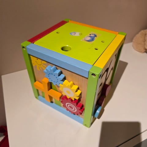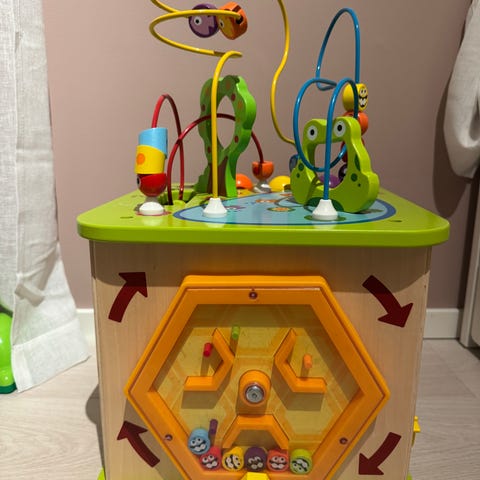 Hape aktivitetskube / ståbord. En fin og solid leke i tre med ulike aktiviteter på hver side som gir mye underholdning. Den er stødig og er derfor perfekt i den perioden barna gjerne vil reise seg men ikke er stødig enda, og med mye forskjellig å gjøre varer den også lenge. Godt brukt, men i fin stand. Mangler en av kulene og en har mistet malingen fordi den ble liggende ute.
