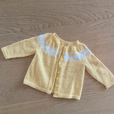 Nydelig hjemmestrikket jakke i str. 80/86. Fargen på det første bildet er mest lik slik den ser ut, den er burgunderrød.