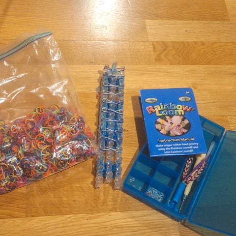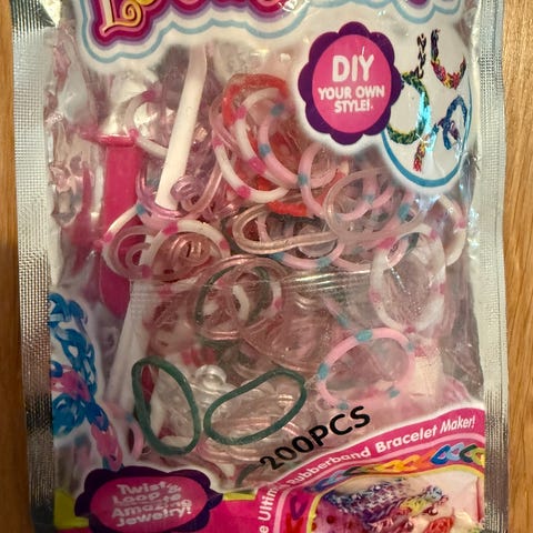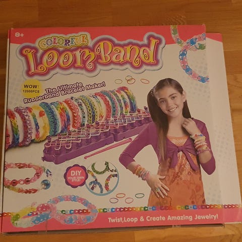 Tiger Rubber Band kit med rammer, kroker, S-klips og gummibånd. Det står instruksjoner på baksiden av boksen. Gummistrikk i mange farger, med og uten glitter.