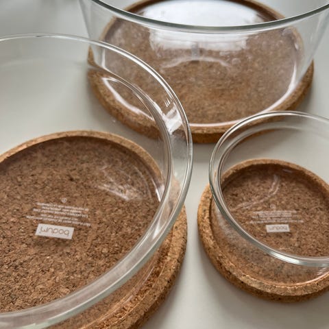 Korkunderlagene beskytter glasset og fungerer som en varmebestandig pute for servering.