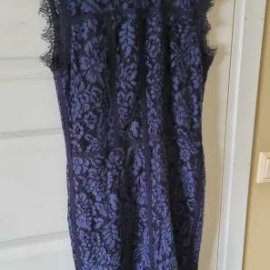 Stilig mørkeblå kjole med smal fasong. To lag stoff; "silke" innerst og blodestoff ytterst. Sitter godt. Kun prøvd på, ikke brukt.