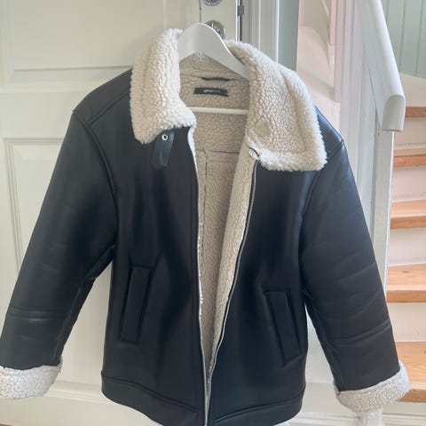 Gina Tricot Vinterjakke i størrelse S, farge svart/svart skinn (ikke ekte) Jakken har en myk, lys fôr og krage, glidelås foran og detaljer som belte og lommer. Materialet er laget for å gi varme og komfort i kalde værforhold, egnet for kvinner.