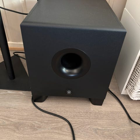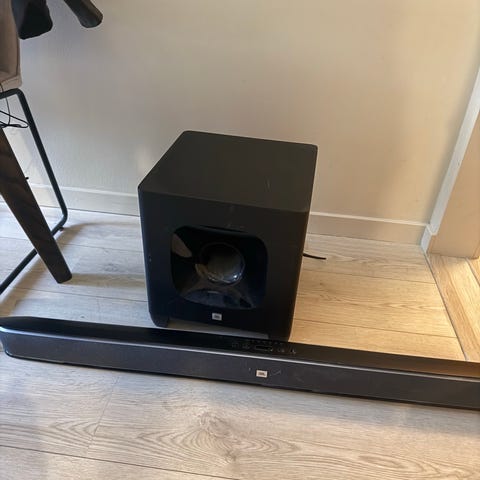 JBL Cinema SB450 subwoofer med svart finish. Designet for å forbedre lydopplevelsen i hjemmekinoanlegg. Kn kun kobles til sb450